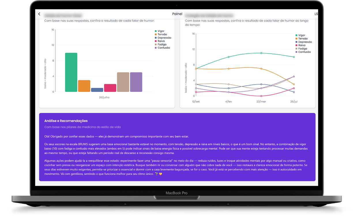 Basta responder a escala. Em menos de 2 minutos, suas respostas são transformadas em gráficos claros que mostram seu perfil emocional, junto com recomendações práticas para o dia a dia.